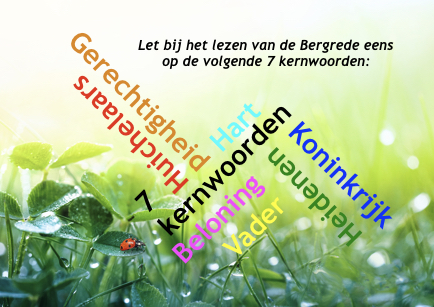 De Bergrede zijn niet zo maar een aantal bij elkaar verzamelde gezegdes en spreuken van Jezus. Er zit een heel duidelijke structuur en opbouw in die de boodschap versterkt en onderbouwt. Hier gaan we komend seizoen ook aandacht aan besteden. Maar voor nu alvast een voorproefje met zeven kernwoorden die belangrijk zijn bij het lezen van de Bergrede. Let bij het lezen van de Bergrede eens extra op deze woorden, waar ze staan en wat ze betekenen.